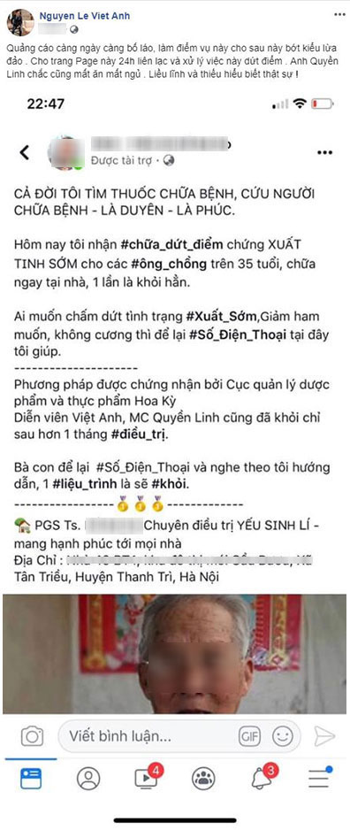 Cụ thể, Việt Anh viết: "Quảng cáo càng ngày càng bố láo, làm điểm vụ này cho sau này bớt kiểu lừa đảo. Cho trang Page này 24h liên lạc và xử lý việc này dứt điểm. Anh Quyền Linh chắc cũng mất ăn mất ngủ. Liều lĩnh và thiếu hiểu biết thật sự".