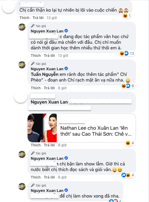 Tuy nhiên, không những không tỏ ra bận tâm, Xuân Lan thậm chí thoải mái trả lời bình luận của bạn bè và fan hâm mộ.