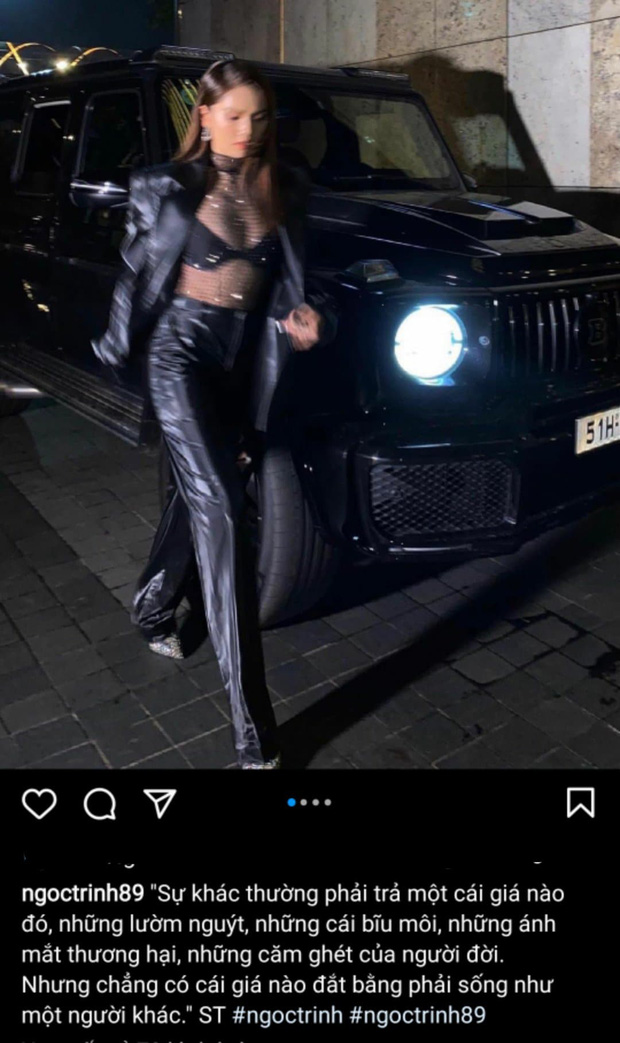 Sau khi bị "ném đá" vì bộ trang phục mặc như không mặc, Ngọc Trinh bất ngờ lên tiếng như ngầm đáp trả. Theo đó, trên Instagram cá nhân, bạn thân Vũ Khắc Tiệp đã đăng tải loạt ảnh diện nội y với áo lưới, đính kèm dòng trạng thái gây chú ý: "Sự khác thường phải trả một cái giá nào đó, những lườm nguýt, những cái bĩu môi, những ánh mắt thương hại, những căm ghét của người đời. Nhưng chẳng có cái giá nào đắt bằng phải sống như một người khác".
