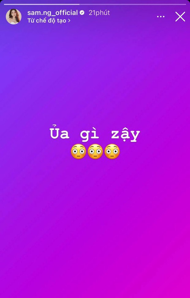 Trên trang cá nhân, nữ diễn viên đăng tải vỏn vẹn 3 chữ: "Ủa gì vậy" kèm biểu tượng như thể hiện sự hoang mang. Mặc dù Sam không trực tiếp đề cập đến vấn đề gì nhưng nhiều người dự đoán đây chính là phản ứng của cô khi dính vào "tai bay vạ gió" liên quan đến chuyện đời tư.