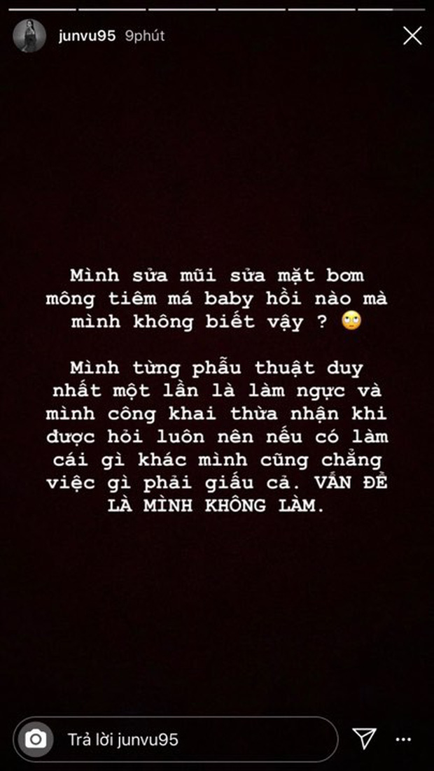 Cụ thể, Jun Vũ viết: "Mình sửa mũi, sửa mặt, bơm mông, tiêm má baby hồi nào mà mình không biết vậy? Mình từng phẫu thuật duy nhất một lần là làm ngực và mình đã công khai thừa nhận khi được hỏi luôn nên nếu có làm cái gì khác mình cũng chẳng việc gì phải giấu cả. Vấn đề là mình không có làm". Đáp trả thẳng thắn của Jun Vũ chắc hẳn khiến những antifan phải "dè chừng", bởi cô nàng tuy sở hữu vẻ ngoài mong manh nhưng lại cực gắt khi lên tiếng trước những đồn đoán tiêu cực về mình.