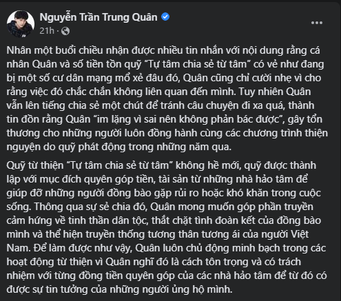 Nguyễn Trần Trung Quân bày tỏ: "Nhân một buổi chiều nhận được nhiều tin nhắn với nội dung rằng cá nhân Quân và số tiền tồn quỹ 'Tự tâm chia sẻ từ tâm' có vẻ như đang bị một số cư dân mạng mổ xẻ đâu đó, Quân cũng chỉ cười nhẹ vì cho rằng việc đó chắc chắn không liên quan đến mình. Tuy nhiên Quân vẫn lên tiếng chia sẻ một chút để tránh câu chuyện đi xa quá, thành t.in đồn rằng Quân 'im lặng vì sai nên không phản bác được', gây tổn thương cho những người luôn đồng hành cùng các chương trình thiện nguyện do quỹ phát động trong những năm qua.