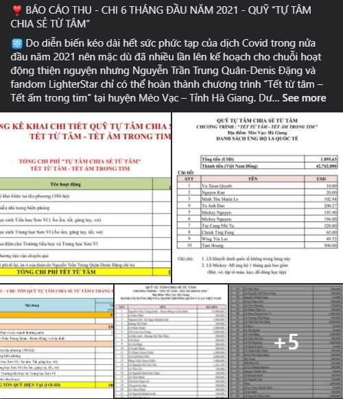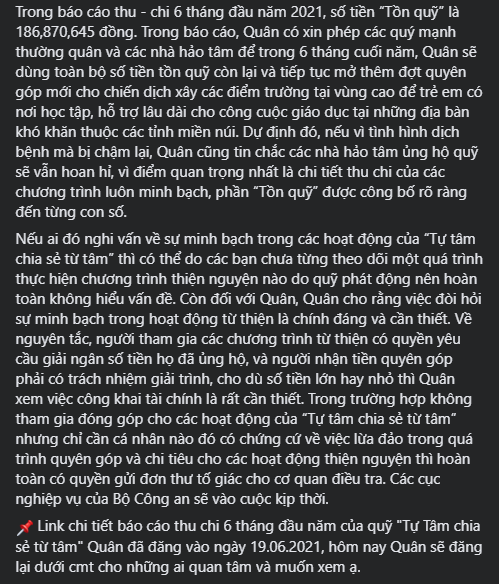 Kết lại bài viết, Nguyễn Trần Trung Quân khẳng định việc đòi hỏi sự minh bạch trong hoạt động từ thiện là cần thiết, đồng thời đính kèm chi tiết báo cáo thu chi 6 tháng đầu năm 2021 của quỹ Tự Tâm chia sẻ từ tâm để khán giả tiện xem xét.
