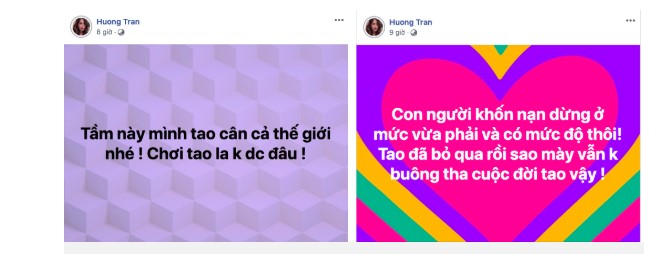 Thậm chí trước đó, cô còn không ngại xưng mày - tao và tuyên bố có thể "cân cả thế giới". Dù Trần Hương không nói rõ người mà mình muốn nhắc đến là ai nhưng vì Quế Vân và Việt Anh đang đi cùng nhau nên không ít người cho rằng, vợ cũ của nam diễn viên đang muốn ám chỉ Quế Vân.