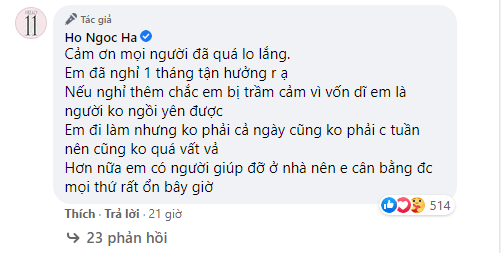 Trước những ý kiến trái chiều, bà xã Kim Lý đã chính thức lên tiếng giải thích. Cô chia sẻ: "Cảm ơn mọi người đã quá lo lắng. Em đã nghỉ 1 tháng tận hưởng rồi ạ. Nếu nghỉ thêm chắc em bị trầm cảm vì vốn dĩ em là người không ngồi yên được. Em đi làm nhưng không phải cả ngày cũng không phải cả tuần nên cũng không quá vất vả. Hơn nữa em có người giúp đỡ ở nhà nên em cân bằng được mọi thứ rất ổn bây giờ".