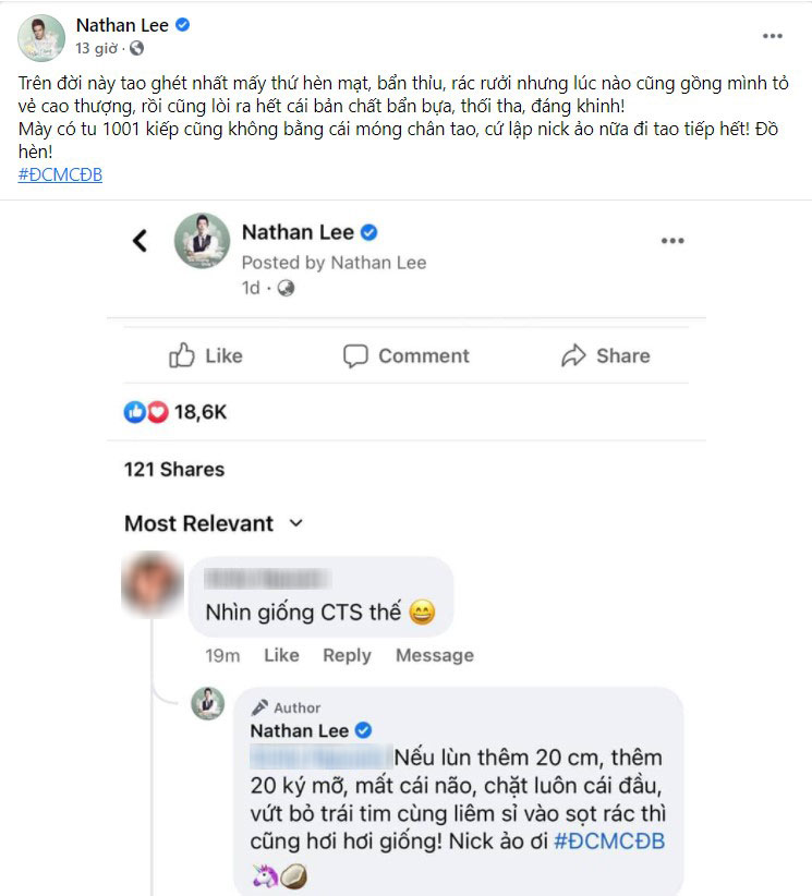 10/08/2021 16:55Bị nhận xét giống Cao Thái Sơn, Nathan Lee lập tức đáp trả bằng hàng loạt từ ngữ nặng nề như 'hèn mạt', 'bẩn thỉu', 'rác rưởi'