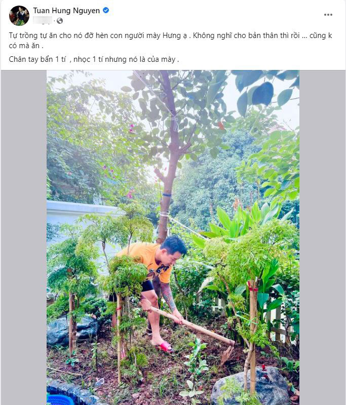 Mới đây, trên trang cá nhân, Tuấn Hưng vừa đăng tải khoảnh khắc làm vườn giản dị, kèm theo đó là dòng chia sẻ: "Tự trồng tự ăn cho nó đỡ hèn con người Hưng ạ. Không nghĩ cho bản thân thì rồi cũng không có mà ăn. Chân tay bẩn 1 tí, nhọc 1 tí nhưng nó là của mày".
