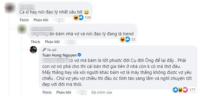 Trước ý kiến tiêu cực, Tuấn Hưng lập tức lên tiếng đáp trả cực gắt: "Có vợ mà bám là tốt phước đời cụ, đời ông để lại đấy. Lấy phải vợ phá thì bàn thờ cũng không có mà thờ đâu. Mấy người hay xỉa xói người khác ăn bám vợ là những người không được vợ yêu chiều. Chứ vợ yêu, vợ chiều thì đầu óc tỉnh táo, sáng tạo lắm và nghĩ chuyện tốt đẹp với đời mà thôi".