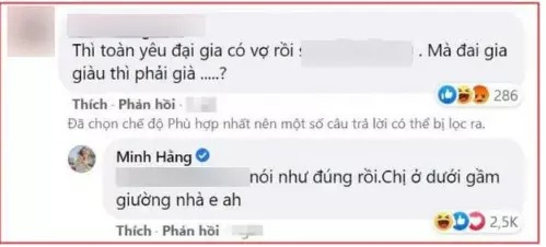 Trước đó, Minh Hằng cũng từng đáp trả tin đồn cặp kè đại gia đã có vợ. Cụ thể, khi một cư dân mạng mỉa mai nữ ca sĩ toàn "yêu đại gia có vợ, giàu và già", cô không ngần ngại lên tiếng: "Nói như đúng rồi, chị ở dưới gầm giường nhà em à".