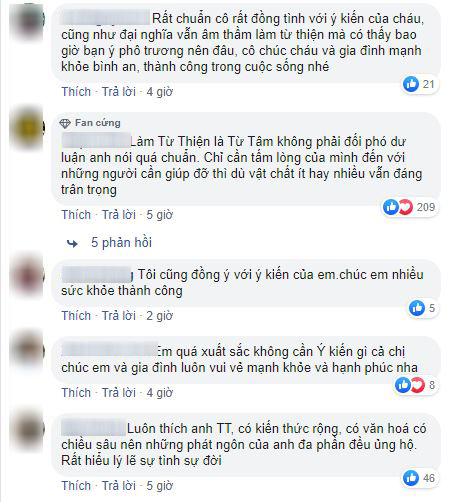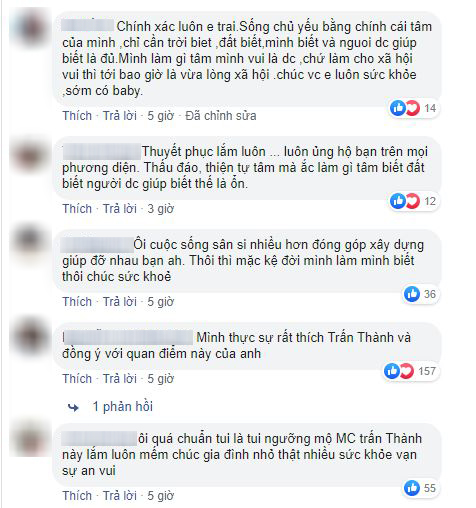 Quan điểm này của Trấn Thành đã nhận được sự ủng hộ của không chỉ người hâm mộ mà đông đảo cư dân mạng cùng bày tỏ ý kiến đồng tình với anh. Ai nấy đều cho rằng Trấn Thành đúng khi cho rằng làm từ thiện nên làm từ cái tâm, ai giúp ích được cho xã hội dù ít hay nhiều cũng đều đáng được trân trọng, không nên đem ra so sánh khiến những việc tốt đẹp dần mất dần đi ý nghĩa vốn có của nó.