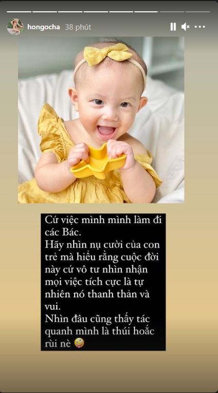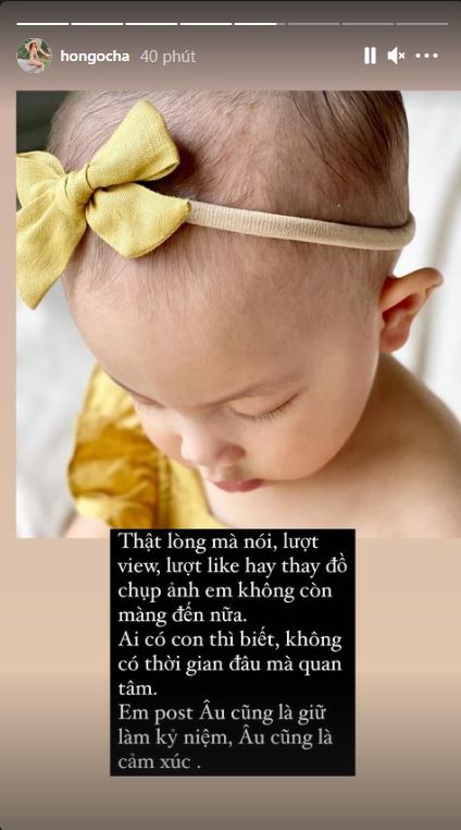 Thật lòng mà nói, lượt view, lượt like hay thay đồ chụp ảnh em không còn màng đến nữa. Ai có con thì biết, không có thời gian đâu mà quan tâm. Em post âu cũng là giữ làm kỷ niệm, âu cũng là cảm xúc. Cứ việc mình mình làm đi các bác. Hãy nhìn nụ cười của con trẻ mà hiểu rằng cuộc đời này cứ vô tư nhìn nhận mọi việc tích cực là tự nhiên nó thanh thản và vui. Nhìn đâu cũng thấy rác quanh mình là thúi hoắc à.