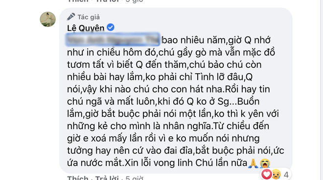 Cô bức xúc chia sẻ thêm: "Bao nhiêu năm, giờ Quyên nhớ như in chiều hôm đó, chú gầy gò mà vẫn mặc đồ tươm tất vì biết Quyên đến thăm, chú bảo chú còn nhiều bài hay lắm, không phải chỉ Tình Lỡ đâu, Quyên nói vậy khi nào chú cho con hát nha. Rồi hay tin chú ngã và mất luôn, khi đó Quyên không ở Sài Gòn. Buồn lắm, giờ bắt buộc phải nói một lần, không thì không yên với những kẻ cho mình là nhân nghĩa. Từ chiều đến giờ em xoá mấy lần rồi vì em không muốn nói nhưng tưởng hay nên cứ vào đai đỉa, bắt buộc phải nói, ức ứa nước mắt. Xin lỗi vong linh chú lần nữa".