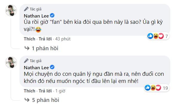 "Lâu lắm mới vào fanpage, thấy bên ả kia feeding toàn nick ảo không, tội nghiệp! Các bạn có muốn vào nhà người khác chửi thì nên có lập luận, chính kiến đàng hoàng chứ cứ chửi đổng như cún ghẻ cắn càn, đàn này đàn nọ mình thấy rất tầm thường! Hình bữa nọ có chửi nên chửi đứa..., mình đã rất nhã nhặn khi che toàn bộ cơ thể lẫn mặt của ai kia, nếu quản lý của ả không nhắc đến cái NẾT thì mình đã không đăng nhé! Nết ghê! Lại cười... Các em ơi! Chiến nhé! Anh tính tha mà chơi feeding bẩn là không được rồi", Nathan Lee mỉa mai.