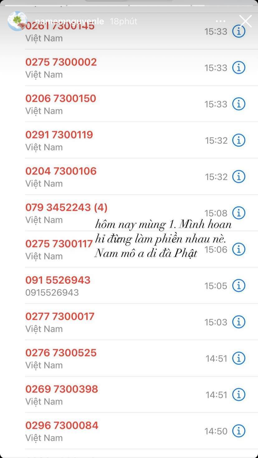 Mới đây trên trang cá nhân, Nam Em đã đăng tải hình ảnh chụp màn hình lịch sử cuộc gọi trên điện thoại cá nhân. Dễ dàng nhận thấy người đẹp liên tục bị quấy rầy bởi nhiều số điện thoại lạ. Ngoài hình ảnh này cô còn than thở: "Hôm nay mùng 1. Mình hoan hỉ đừng làm phiền nhau nè. Nam mô a di đà phật".