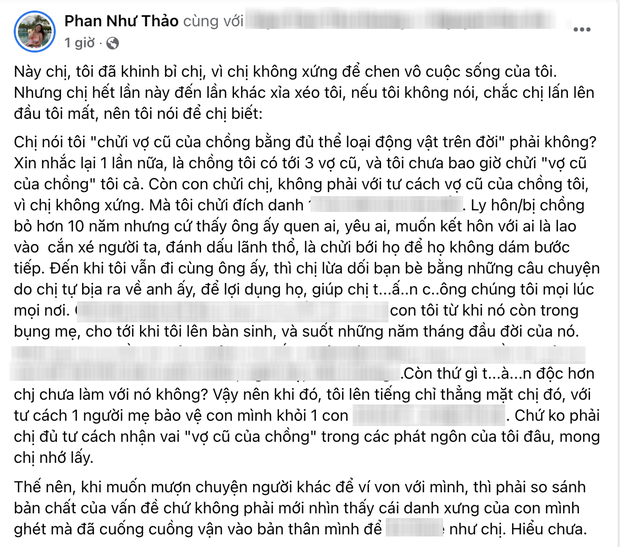Chị nói tôi "chửi vợ cũ của chồng bằng đủ thể loại động vật trên đời" phải không? Xin nhắc lại 1 lần nữa, là chồng tôi có tới 3 vợ cũ, và tôi chưa bao giờ chửi "vợ cũ của chồng" tôi cả. Còn con chửi chị, không phải với tư cách vợ cũ của chồng tôi, vì chị không xứng. Mà tôi chửi đích danh 1 con đàn bà nhơ bẩn. Ly hôn/bị chồng bỏ hơn 10 năm nhưng cứ thấy ông ấy quen ai, yêu ai, muốn kết hôn với ai là lao vào cắn xé người ta, đánh dấu lãnh thổ, là chửi bới họ để họ không dám bước tiếp.