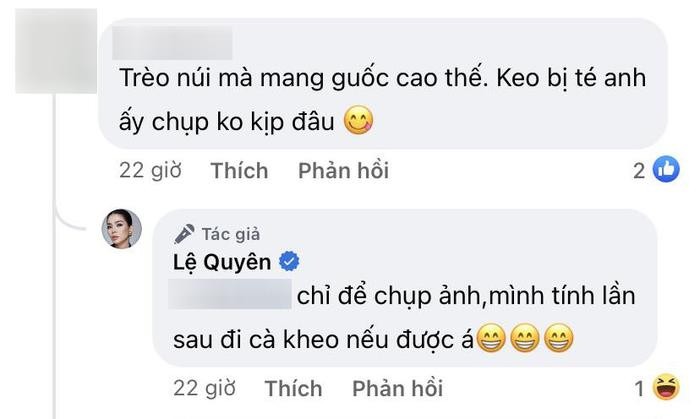 Đáng chú ý, một netizen lại bất ngờ để lại bình luận kém duyên, soi mói chuyện Lệ Quyên mang guốc cao đi leo núi. Cụ thể, người này viết: "Trèo núi mà mang guốc cao thế kẻo bị té anh ấy chụp không kịp đâu". Không lâu sau đó, giọng ca Mong manh tình về đã có động thái đáp trả. Lệ Quyên cho biết: "Chỉ để chụp ảnh, mình tính lần sau đi cà kheo nếu được á".