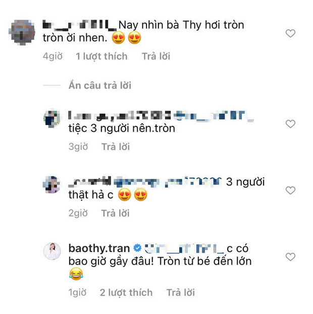 Đáng nói nhất, ngay trong tiệc sinh nhật của Bảo Thy, cô diện chiếc áo rộng nhưng vòng 2 vẫn nhô lên, lùm lùm thấy rõ. Đặc biệt, khi 1 netizen bình luận dạo gần đây Bảo Thy có vẻ tròn trịa và liền được chính chủ đáp ngay và luôn: "Chị có bao giờ gầy đâu, tròn từ bé đến lớn".
