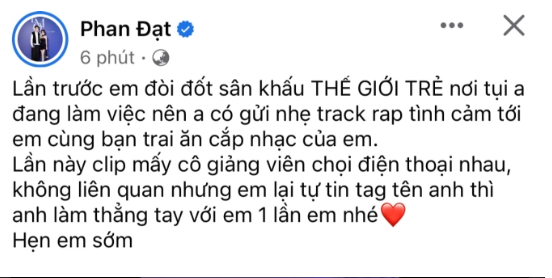 "Lần trước em đòi đốt sân khấu Thế giới trẻ - nơi tụi anh đang làm việc nên anh có gửi nhẹ track rap ‘tình cảm' tới em cùng bạn trai ăn cắp nhạc của em. Lần này clip mấy cô giảng viên chọi điện thoại nhau không liên quan nhưng em lại tự tin tag tên anh thì anh làm thẳng tay với em 1 lần em nhé. Hẹn em sớm". Phan Đạt chia sẻ trên trang cá nhân.