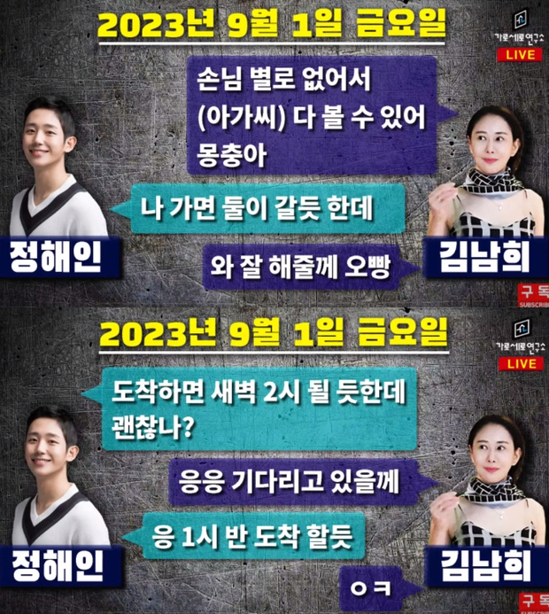 Vào tối ngày 5/12, kênh YouTube Viện Garo Sero bất ngờ tiết lộ Jung Hae In là khách quen của hộp đêm trong vụ Lee Sun Kyun dùng ma túy. "Madam K (Kim Nam Hee)" - nữ quản lý hộp đêm kiêm nhân tình của Lee Sun Kyun cũng có mối liên hệ với Jung Hae In. Viện Garo Sero còn hé lộ những tin nhắn của Jung Hae In với Kim Nam Hee vào ngày 1/9, nội dung là nam diễn viên sẽ đến hộp đêm lúc 1-2h sáng.