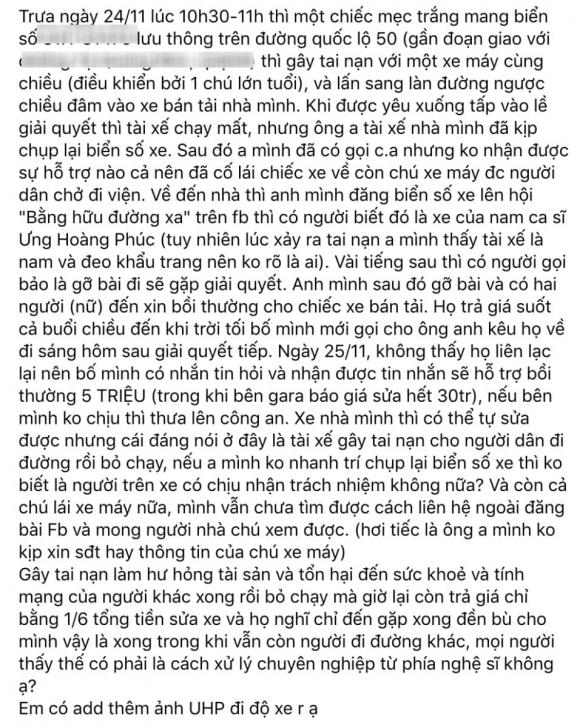Khán giả đăng bài tố viết rằng: "Khi được yêu cầu tấp vào lề để giải quyết vụ việc, nam tài xế bỏ chạy dù thiệt hại rất lớn về người và tài sản. Tuy nhiên sau khi bị hại truy ra biển số xe trên là của ca sĩ Ưng Hoàng Phúc, có người gọi bảo là gỡ bài đi sẽ gặp giải quyết. Họ trả giá suốt cả buổi chiều, kêu hỗ trợ bồi thường 5 triệu (trong khi bên gara báo giá sửa hết 30 triệu), nếu bên mình không chịu thì thưa lên công an. Gây tai nạn làm hư hỏng tài sản và tổn hại đến sức khoẻ và tính mạng của người khác xong rồi bỏ chạy mà giờ lại còn trả giá chỉ bằng 1/6 tổng tiền sửa xe".