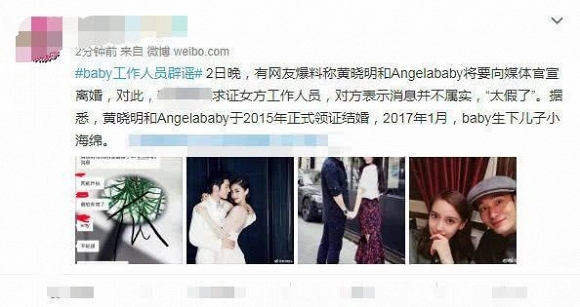 Truyền thông đưa tin, tòa án Bắc Kinh vừa thông báo vợ chồng Huỳnh Hiểu Minh và Angelababy thắng kiện trong vụ việc bị tung tin ly hôn trên mạng. Cụ thể trước đó, trên mạng lan truyền tin đồn Huỳnh Hiểu Minh và Angelababy đã ly hôn. Kiểu tin này khiến dân mạng lập tức bàn tán và tạo ra nhiều tranh luận lớn nhỏ trên những trang mạng. Nhân viên công tác của phòng làm việc của Angelababy cũng nhanh chóng phản hồi, lên tiếng bác bỏ tin đồn, biểu thị tin tức giả.