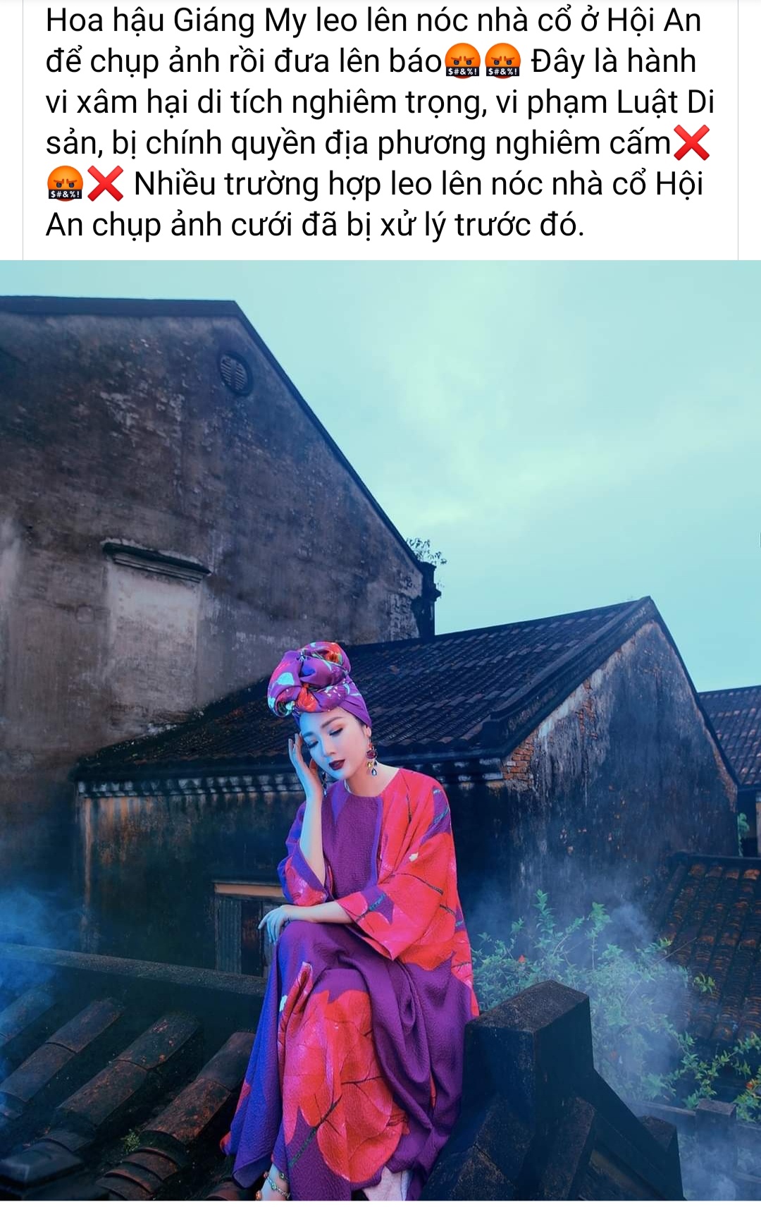 Vào chiều cùng ngày, một số trang mạng xã hội đăng tải hình ảnh hoa hậu Giáng My đã ngồi lên một mái ngói của căn nhà cổ nằm trong phố cổ Hội An.