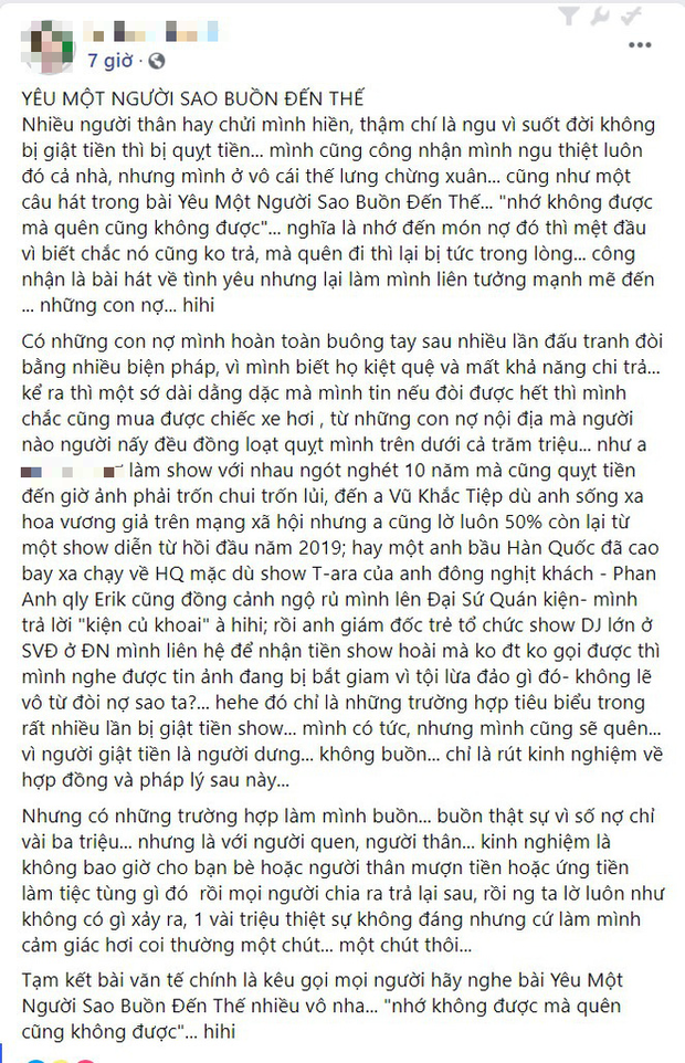 Vào trưa 8/11, quản lý Noo Phước Thịnh đã khiến cộng đồng mạng dậy sóng khi đăng tải dòng trạng thái dài tố hàng loạt nhân vật nợ tiền nhưng mãi không trả. Trong đó, đáng chú ý nhất phải kể đến việc quản lý này tố Vũ Khắc Tiệp còn nợ 50% cát xê của anh từ đầu năm 2019. Cụ thể, anh viết: "Từ những con nợ nội địa mà người nào người nấy đều đồng loạt quỵt mình trên dưới cả trăm triệu. Đến anh Vũ Khắc Tiệp dù anh sống xa hoa vương giả trên mạng xã hội nhưng anh cũng lờ luôn 50% còn lại từ một show diễn từ hồi đầu năm 2019". Dòng trạng thái đã trở thành chủ đề nóng, được nhiều khán giả bàn luận trên khắp các trang MXH.