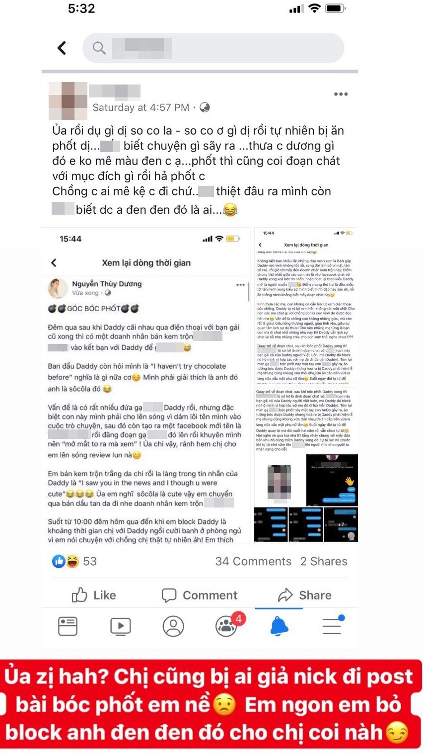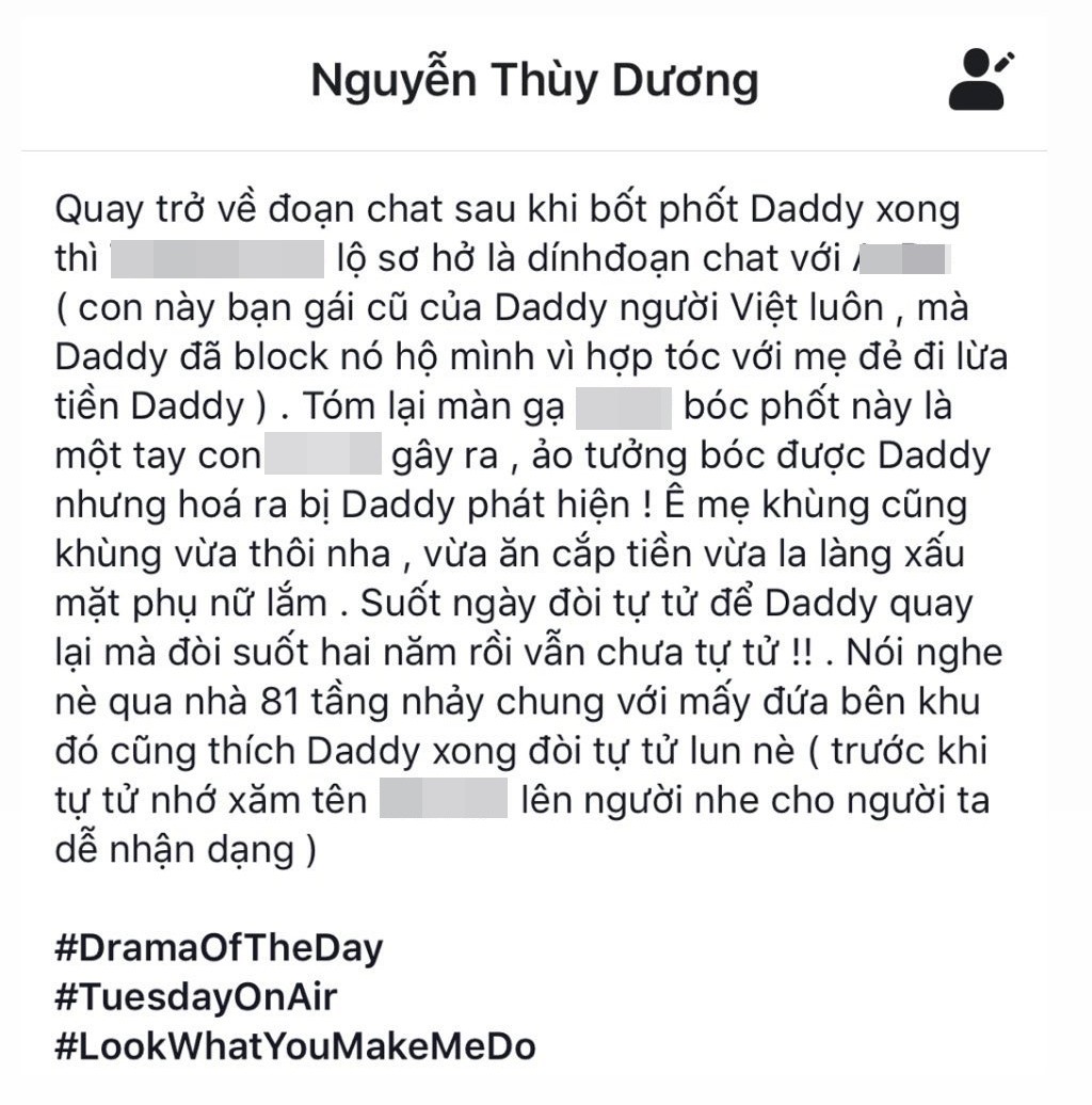 Trên trang cá nhân, Thùy Dương tiếp tục cập nhật những tình tiết mới của "drama" này. Nữ người mẫu cho rằng hot girl trên đã chặn facebook của hai vợ chồng cô, báo cáo để khóa bài viết "bóc phốt" của Thùy Dương.