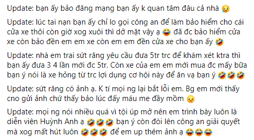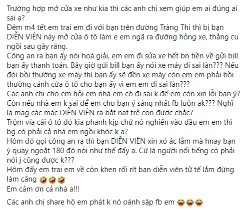 Cụ thể, người này cho biết vào đêm mùng 4 Tết đang đi trên đường thì gặp xe ô tô của Huỳnh Anh bất ngờ mở cửa, khiến xe máy bị ngã và người ngồi sau còn gãy răng. Tại hiện trường, khi công an đến giải quyết thì Huỳnh Anh đề nghị hòa giải, chấp nhận thanh toán thiệt hại về xe máy và người bị gây tai nạn. Tuy nhiên, sau khi cư dân mạng này đi sửa xe và gửi hóa đơn thì Huỳnh Anh lại kì kèo, lấy lí do xe máy đi sai làn nên không thanh toán tiền sửa xe, thậm chí còn đòi ngược lại tiền sửa chữa cánh cửa ô tô.