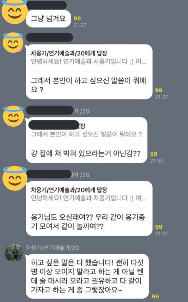 Nam idol tân binh ở đây chính là nam idol Woonggi (TOO). Bạn của anh đã đăng tải đoạn tin nhắn từ nhóm chat của các sinh viên trong lớp đại học. Khi bạn bè muốn tụ tập trên 20 người, Woonggi đã trả lời rằng: "Xin chào, mình là Cha Woonggi, sinh viên chuyên ngành diễn xuất. Đây là nhóm chat của toàn khóa 21, mình nghĩ lời nói của bạn đã vượt quá giới hạn. Và mình không nghĩ tiệc rượu có 20 người ở Đại học Konkuk là thứ nên khoe khoang". Đoạn tin nhắn của nam idol được gửi khi toàn dân Hàn Quốc đang thực hiện giãn cách xã hội vì dịch COVID-19, chính phủ cấm tụ tập trên 5 người.