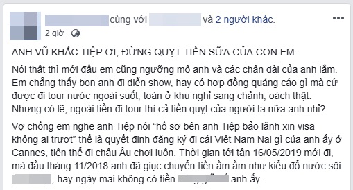 "Vì tin tưởng anh nên 18/11/2018 vợ chồng em chuyển đủ 116.5 triệu (50% số tiền đi tour 06 ngày với Venus - công ty của Vũ Khắc Tiệp). Lúc đó, làm gì ký hợp đồng, hay nộp hồ sơ gì!? Vì là tình cảm quan hệ cá nhân, tin nhau là chính, nên mới chuyển thế. Chứ chỗ khác mà gọi là đặt cọc thì cứ hợp đồng đàng hoàng rồi mới chuyển cọc, chứ ai ngu gì chuyển tiền khơi khơi thế, nhất là người có "tiếng tốt" như anh, Vũ Khắc Tiệp nhỉ?