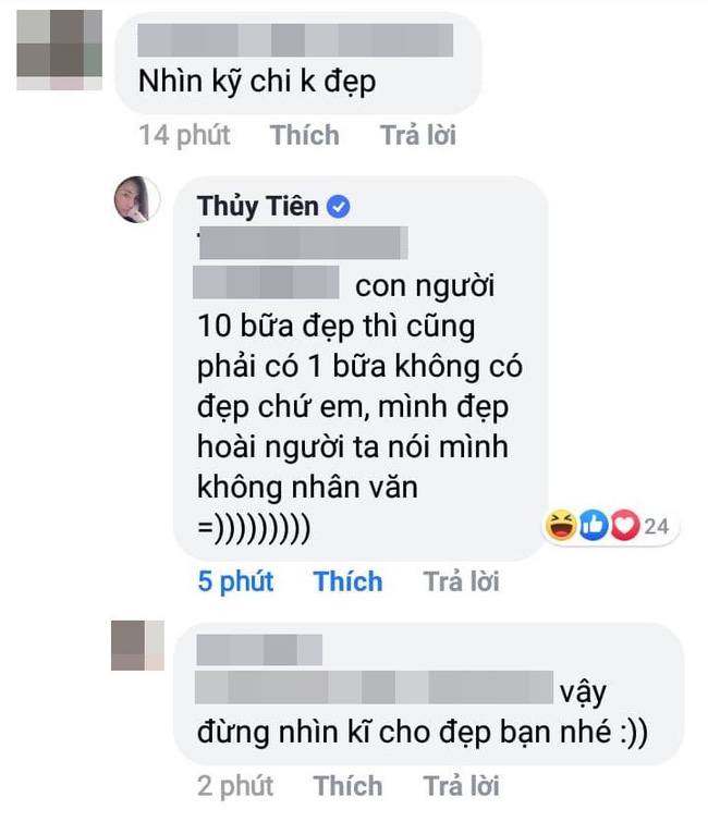 Tuy nhiên, ngay dưới phần bình luận của clip này cũng xuất hiện một lời chê bai: "Nhìn kỹ chị không đẹp". Đương nhiên là phụ nữ thì không ai muốn người khác chê nhan sắc của mình, lại còn chê công khai như vậy. Thế nên Thủy Tiên đã có màn đáp trả vừa nhẹ nhàng, vừa hài hước nhưng cũng đủ "đanh đá" để làm anti-fan "cứng họng".