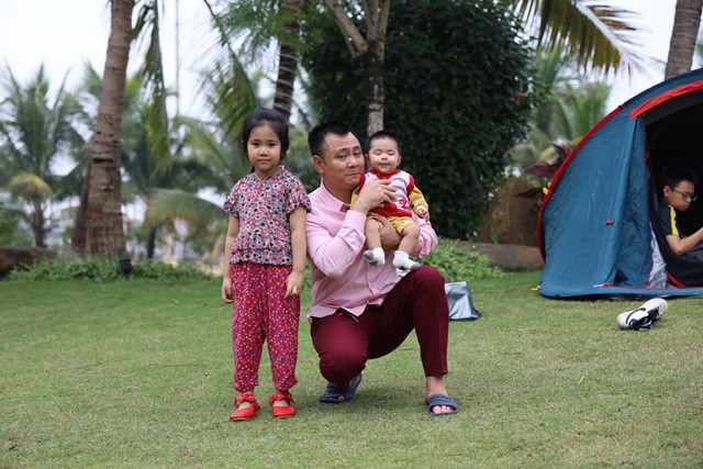 Bố con nhà danh hài Tự Long tạo dáng nhí nhảnh trong không gian vườn rộng lớn của nghệ sĩ Xuân Bắc.
