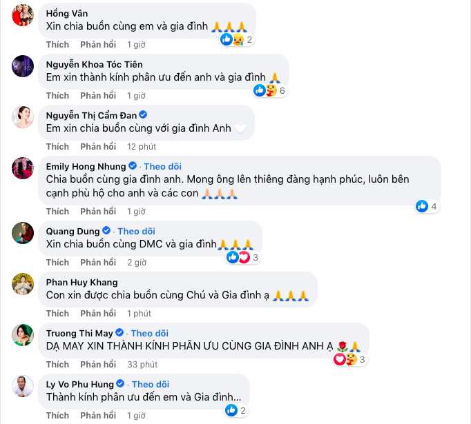 Bên dưới phần bình luận, nhiều sao Việt như NSND Hồng Vân, Hoa hậu Đền Hùng Giáng My, siêu mẫu Vũ Cẩm Nhung, ca sĩ Quang Dũng, ca sĩ Tóc Tiên... gửi lời chia buồn đến Đỗ Mạnh Cường và gia đình: