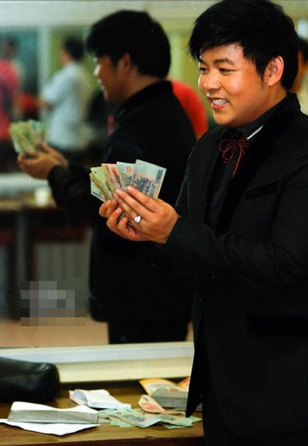 Phía sau ánh đèn sân khấu, Quang Lê thể hiện sự vui vẻ khi cầm trên tay cả xấp tiền. |