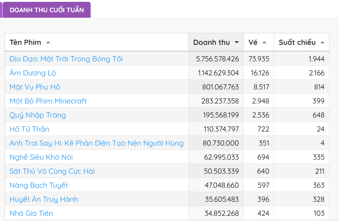 Hiện tại, do chỉ đang trong thời gian chiếu sớm, số suất chiếu có phần khiêm so với Âm Dương Lộ nhưng doanh thu Địa Đạo: Mặt Trời Trong Bóng Tối lại bỏ rất xa đối thủ. Trong ngày 3/4, phim thu về gần 6 tỷ trong khi Âm Dương Lộ chỉ kiếm được hơn 1 tỷ. Các đối thủ còn lại không có tác phẩm nào vượt ngưỡng doanh thu 1 tỷ trong ngày.