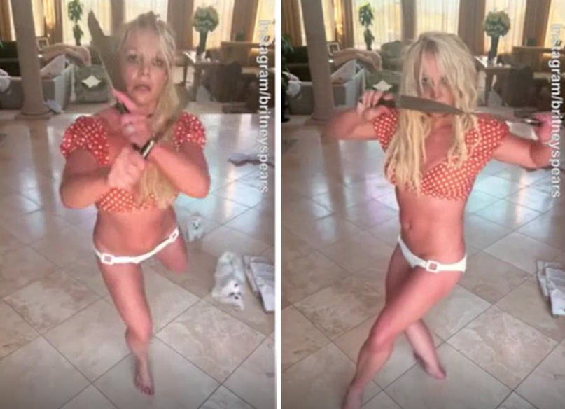 Britney Spears vừa đăng tải đoạn video múa dao trong tình trạng thiếu vải. Nữ ca sĩ diện trang phục hai mảnh đồng thời thực hiện động tác múa dao cực kì nguy hiểm.