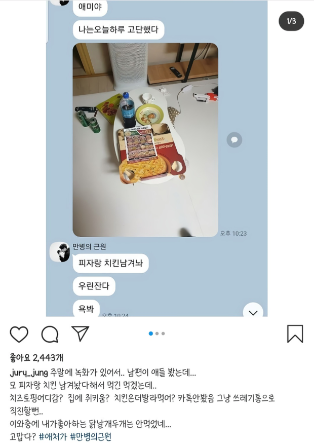Cụ thể Jung Yuri viết: "Vì tuần này tôi có lịch ghi hình nên chồng phải ở nhà chăm con. Anh ấy nói rằng để lại thức ăn cho tôi nhưng phô mai đâu rồi? Anh đã ăn hết gà rán rồi hả? Nếu không đọc tin nhắn từ trước thì chắc em đã vứt hộp pizza này vào thùng rác rồi. Nhưng anh vẫn để cho em phần cánh gà em thích nhất. Cảm ơn anh".