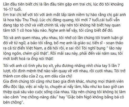 Trước ngày cử hành tang lễ cho Nguyễn Thu Thủy, em dâu của cựu Hoa hậu cũng đã có bức tâm thư dài chia sẻ cảm xúc trong những ngày đau buồn của gia đình và đặc biệt nhắc về chị chồng.