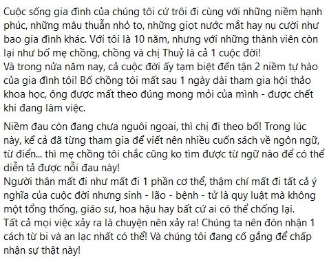 Bên cạnh đó, cô cũng hứa sẽ thay chị nuôi nấng hai con nhỏ nên người: "Phải trải qua nỗi đau mất đi người thân, mới biết cuộc đời vô thường là thế nào. Ngày mai, mọi người sẽ đưa tiễn chị về với bố, về với thế giới mới. Nơi đó chị vẫn sẽ đẹp, vẫn sẽ đọc sách và chạy bộ, chị nhé! Các con của chị, gia đình sẽ thay chị yêu thương và nuôi dạy nên người! Tạm biệt chị!".