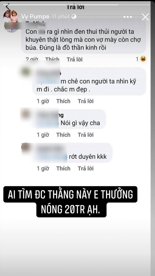 Cụ thể, bà xã Mạc Văn Khoa đã đăng tải ảnh chụp màn hình phần bình luận của nhân vật này với nội dung: "Con gì đen thui thủi người ta khuyên thật lòng mà con vợ mày còn chợ búa. Đúng là đồ thần kinh rồi". Trước ý kiến tiêu cực này, Vy Pumpe đã không kìm được sự tức giận và tuyên bố: "Ai tìm được thằng này em thưởng nóng 20 triệu ạ".