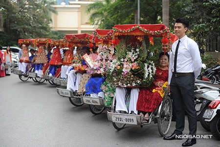 | Chú rể Đặng Văn Quỳnh và gia đình muốn có lễ ăn hỏi theo phong cách truyền thống nên đã thuê 9 chiếc xích lô mang lễ đến nhà gái. |