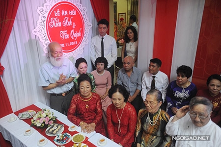 | Giáo sư Văn Như Cương đại diện cho nhà trai thưa chuyện với gia đình nhà gái. Ông chúc cho hai cháu sẽ xây dựng tổ ấm hạnh phúc. |