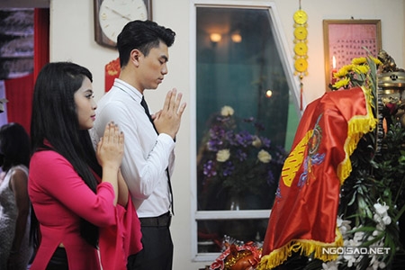 | Đôi uyên ương cùng thực hiện nghi lễ trước bàn thờ gia tiên. |
