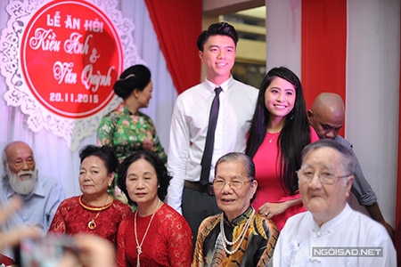 | Sau khi hoàn tất các thủ tục xin dâu, Kiều Anh và ông xã tương lai không ngần ngại trao cho nhau cử chỉ âu yếm. |