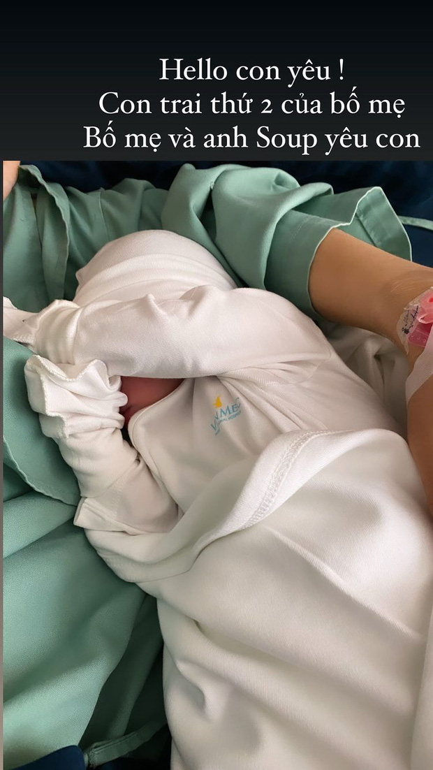 Cụ thể trưa nay, trên story Instagram, Kiều Anh vui mừng viết: "Hello con yêu! Con trai thứ hai của bố mẹ. Bố mẹ và anh Soup yêu con".