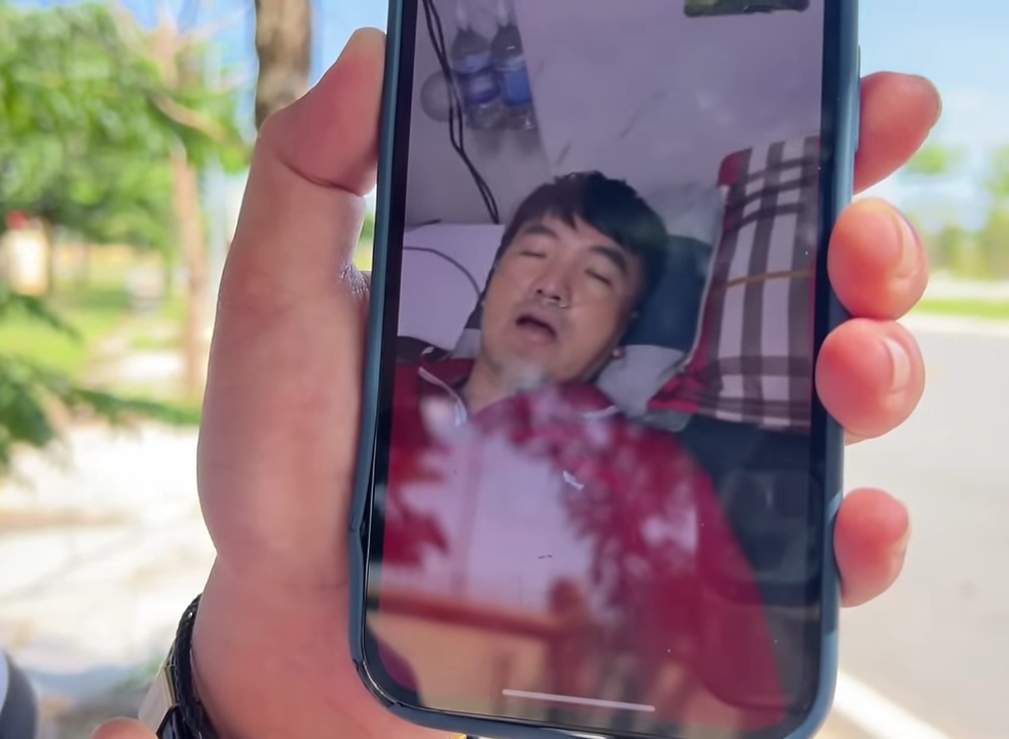 Nói rồi, Khương Dừa liền gọi Facetime cho Dương Ngọc Thái thì thấy nam ca sĩ đang nằm tiều tụy trên giường bệnh, phải đeo ống thở ở mũi, sức khỏe yếu.