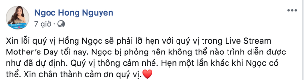 Trên trang cá nhân của nữ ca sĩ Hồng Ngọc mới đây đã đăng tải thông báo phải huỷ buổi diễn trực tuyến tại Mỹ vì lý do cô mới gặp sự cố bị bỏng do nổ nồi xông hơi. Không riêng Hồng Ngọc, ông xã của cô - Thomas Tâm Nguyễn cũng đăng tải thông tin này tới khán giả và hứa sẽ "bù đắp" công chúng bằng buổi diễn khác khi có thể: "Xin lỗi quý vị Hồng Ngọc sẽ phải lỡ hẹn với quý vị trong livestream Mother’s Day. Ngọc bị phỏng nên không thể nào trình diễn được như đã dự định. Quý vị thông cảm nhé. Hẹn một lần khác khi Ngọc có thể. Xin cảm ơn quý vị".