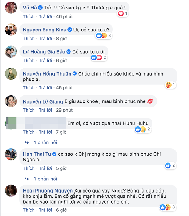 Thông tin này đã làm đông đảo bạn bè nghệ sĩ và khán giả không khỏi lo lắng. Ở phần bình luận, nhiều sao Việt như Bằng Kiều, Vũ Hà, Thanh Thảo, Lê Giang... đều để lại lời nhắn mong nữ ca sĩ giành nhiều thời gian nghỉ ngơi để sớm bình phục. Hiện tại, ngoài thông báo phải huỷ buổi diễn do sự cố, phía ca sĩ Hồng Ngọc vẫn chưa có thêm chia sẻ gì về tình hình sức khoẻ của cô.