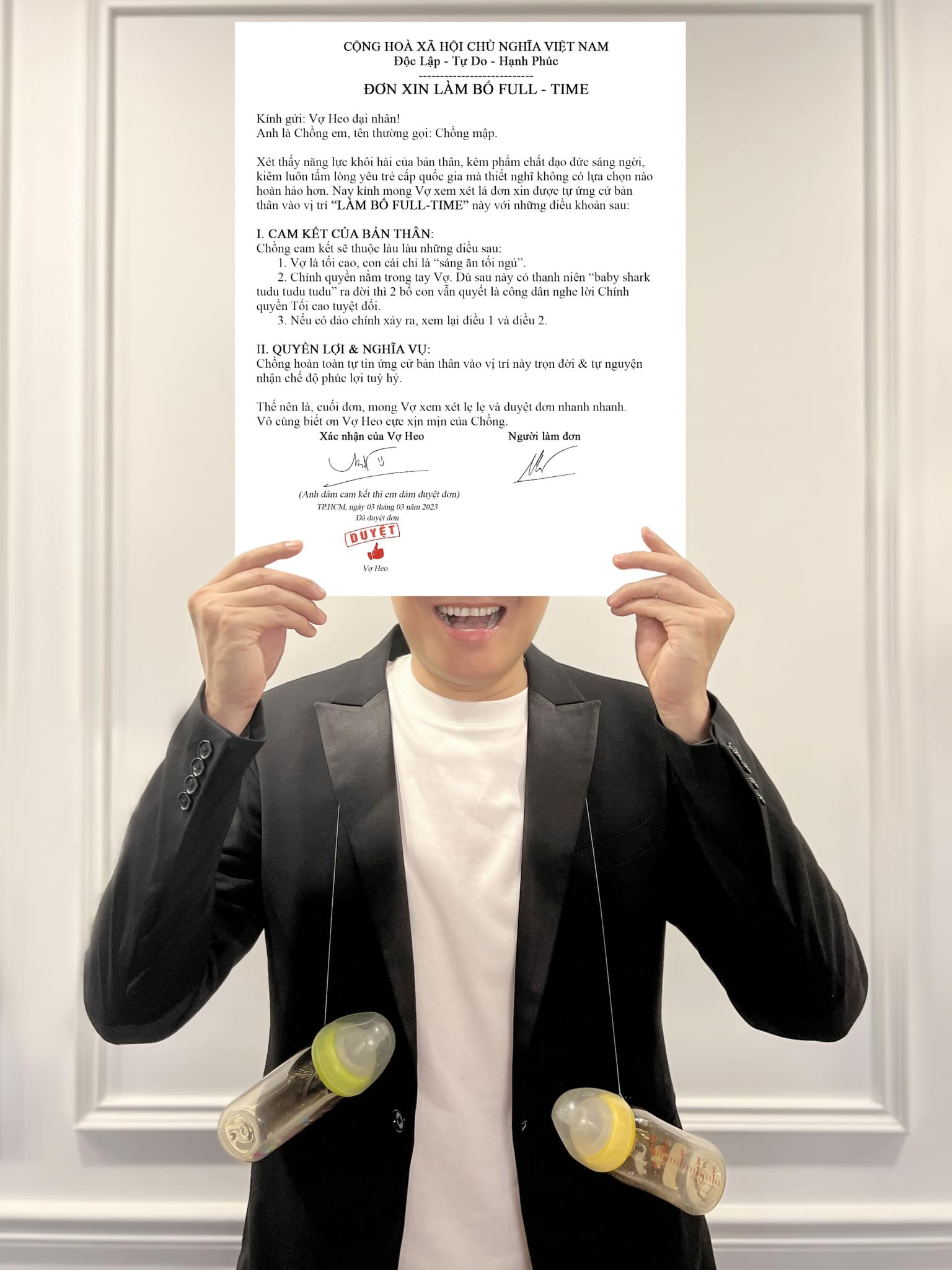 Không chỉ chia sẻ bài viết, ca sĩ Minh Hằng còn hài hước chia sẻ khoảnh khắc ông xã cầm trên tay "đơn xin làm bố full-time", kèm theo đó hai hai bình sữa trông vô cùng hài hước và đáng yêu. Đặc biệt dù chuẩn bị làm mẹ và kết hôn hơn nửa năm, song ca sĩ Minh Hằng vẫn giữ nguyên một việc là giấu mặt ông xã.